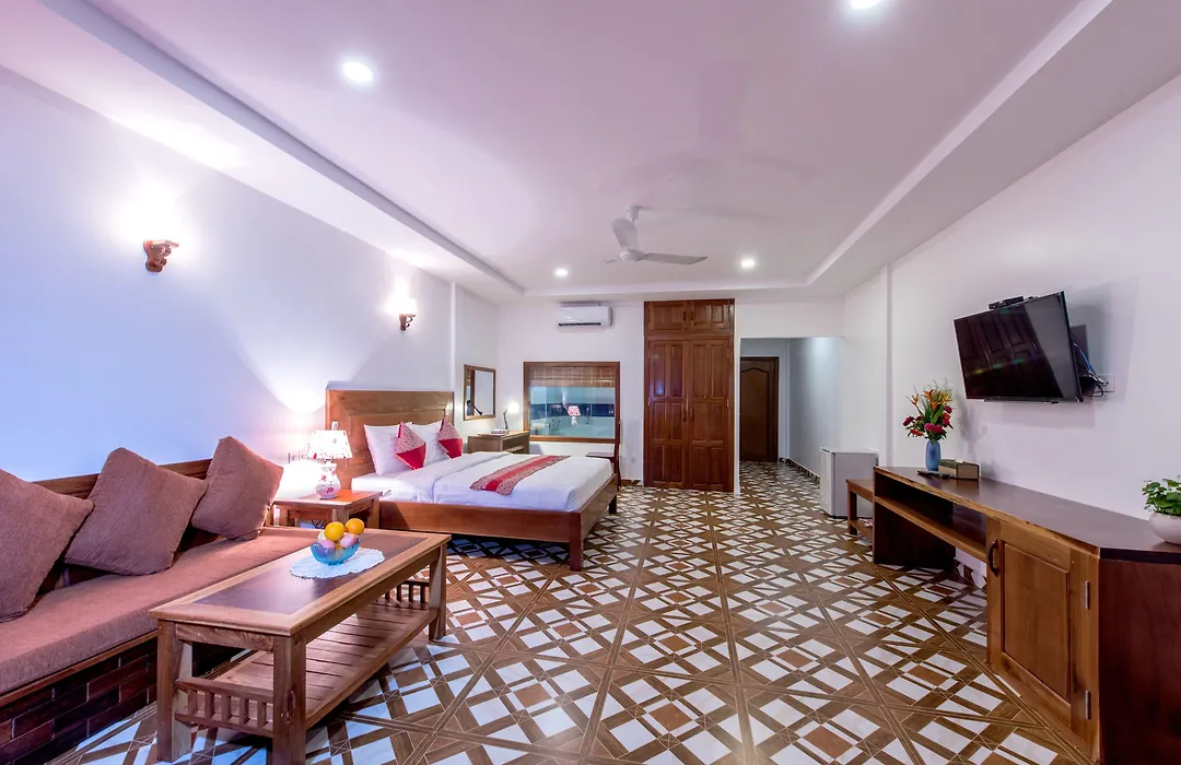 L'hotel est également à 15 minutes en voiture un site naturel tel que la Résidence royale. Le quartier compte de nombreux sites commerciaux tels que le Centre artistique de Siem Reap à 3,1 km d'Amour D' Angkor de Siem Reap. Vous pouvez prendre le bus à l'arrêt RMN Rith Mony Transport, à côté de cet hotel.
